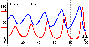 Der Graph zeigt eine typische Räuber-Beute-Kurve eines Modells, indem sich die Veränderung der Beutepopulation erst nach einer gewissen Zeit auf die Räuberpopulation auswirkt: Das System schaukelt sich auf!