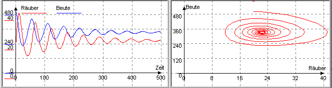 Modell einen Gleichgewichtspunkt bei ca. 22 Räubern und ca 335 Beutetieren